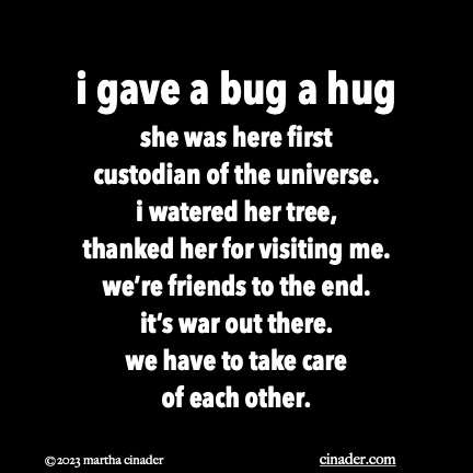 she was here first custodian of the universe. i watered her tree, thanked her for visiting me. we’re friends to the end. it’s war out there. we have to take care of each other.
